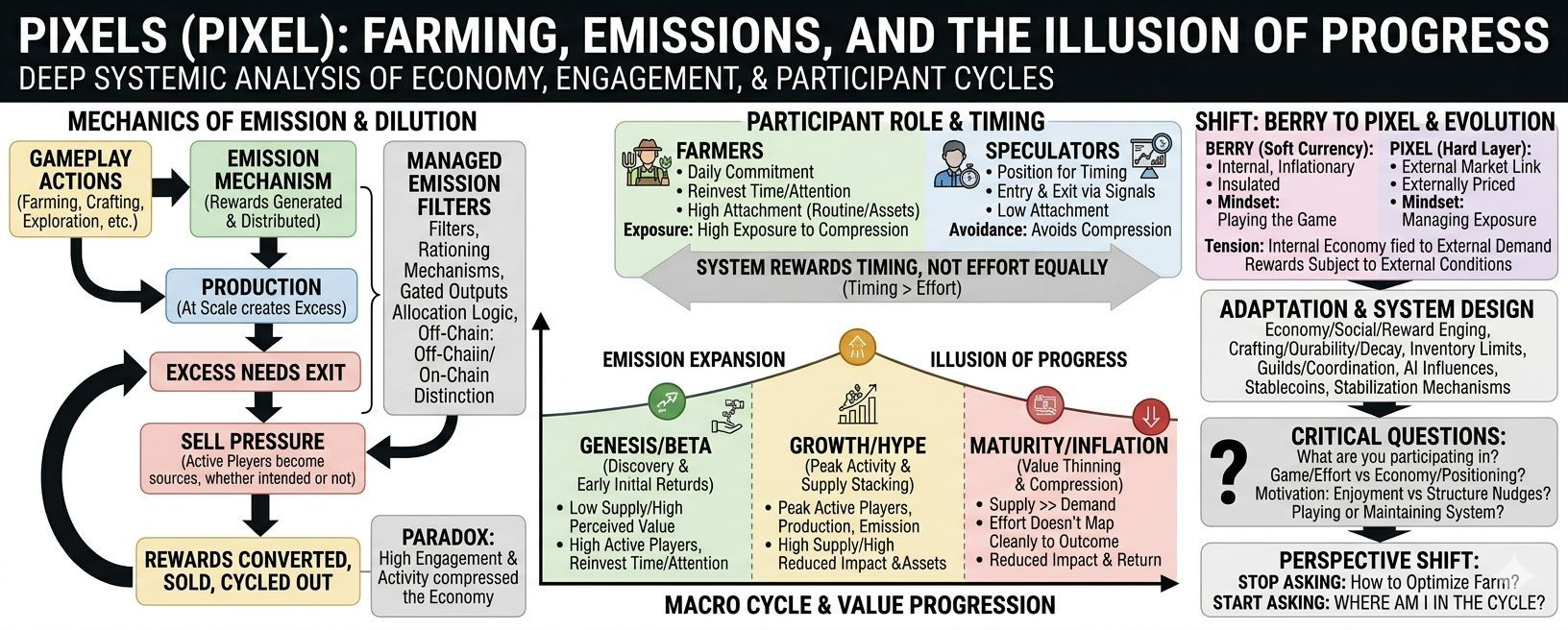 热闹只是表象,真正决定生死的,是产出、需求、通胀与抛售压力之间的平衡。而在Pixels里,这种平衡从一开始就偏向不对称。