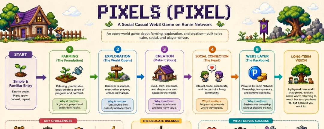 I’ve been thinking about PIXELS in a slightly more everyday, almost casual way—not like some big “Web3 innovation” everyone keeps talking about, but like a place you quietly return to after a long day. You know that feeling when you don’t want intensity, you just want something simple, something steady? That’s kind of where this game sits in my mind. Pixels (PIXEL), running on the Ronin Network, is built around farming, exploration, and creation, but when you actually spend time with it—even just mentally imagining the loop—it feels less like a system and more like a routine trying to form.