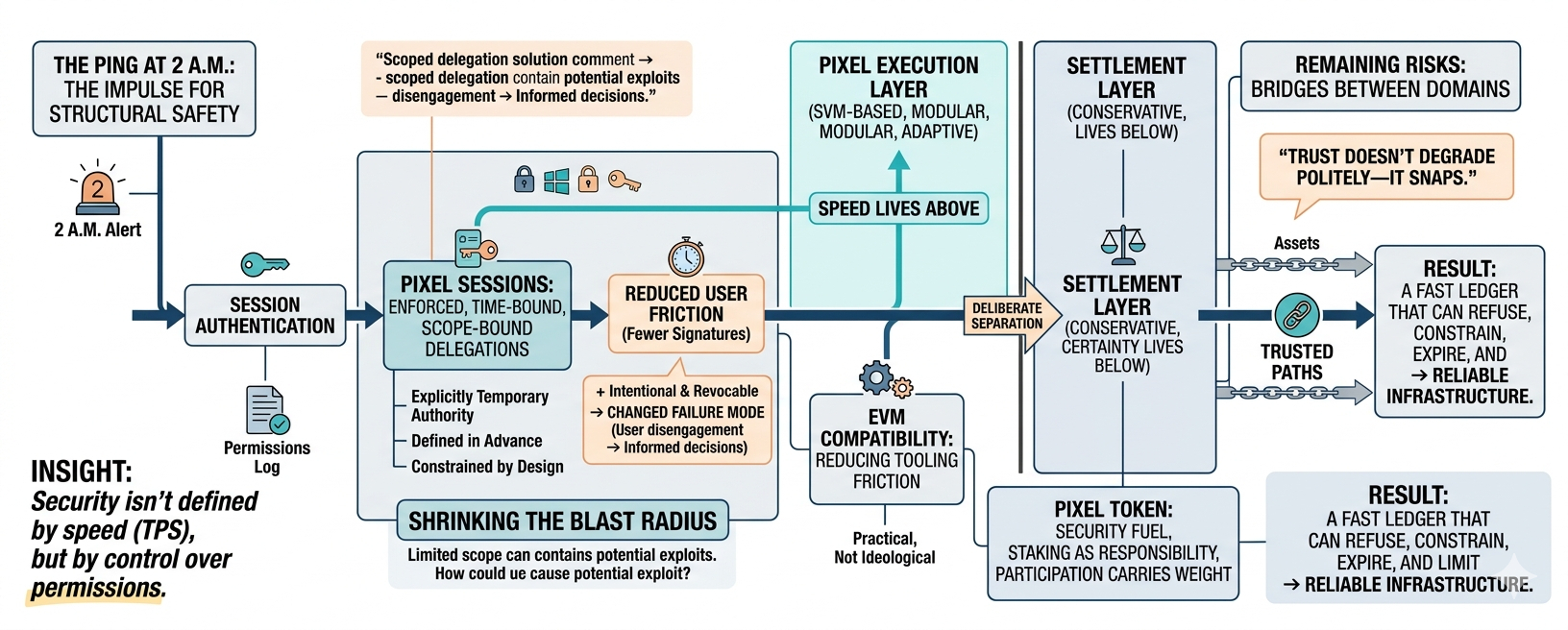 so the question isn’t whether PIXEL is fast. it is. the question is whether it understands where failure actually comes from. and increasingly, that answer seems to be yes. not from slow blocks or insufficient throughput, but from permissions that outlive their purpose and keys that carry too much authority for too long.