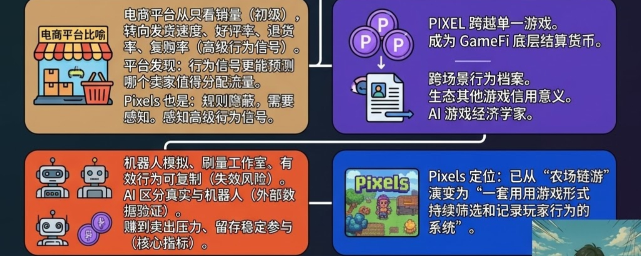 这让丰仔想到一个生活中的真实场景:电商平台早期只看销量,后来开始看发货速度、好评率、退货率、复购率,不是因为这些数据更好看,而是因为平台发现,这些行为信号比销量更能预测哪个卖家值得被分配更多流量。Pixels给丰仔的感觉越来越像这个逻辑,只是它没有把规则写出来,玩家需要自己感知。