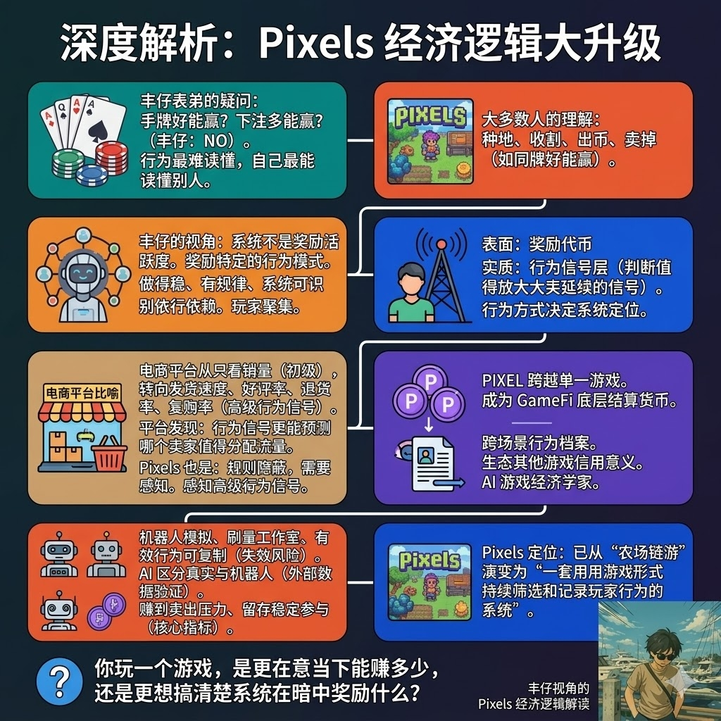 丰仔的总结是这样的:表面上它是奖励代币:玩家做了某件事,系统给 PIXEL。但当奖励开始向特定行为模式倾斜的时候,这个代币就不只是计价工具了:它变成了系统判断哪些玩家行为值得被放大、被延续、被带入下一个阶段的信号层。不是玩家花了多少 PIXEL,而是玩家用什么样的方式参与,这决定了玩家在这个系统里的定位。
