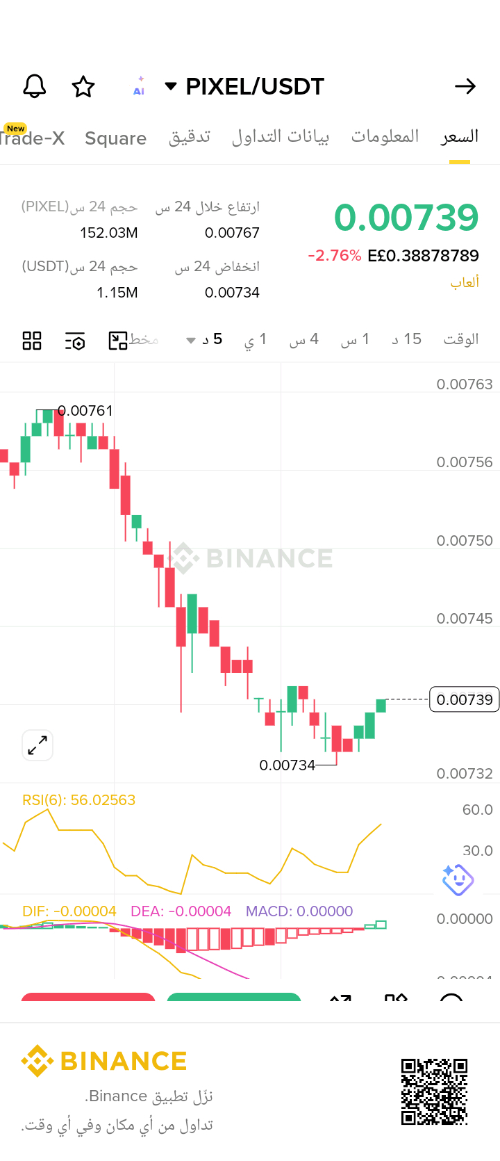 تمر عملة @Pixels Pixels حالياً بمرحلة فنية هامة جداً يراقبها المتداولون بدقة. بعد الهبوط الأخير، نجد أن السعر وجد دعماً قوياً عند مستويات 0.00734، وبدأت الشموع الخضراء في الظهور على إطار الـ 5 دقائق، مما يشير إلى دخول سيولة شرائية عند هذه القيعان.