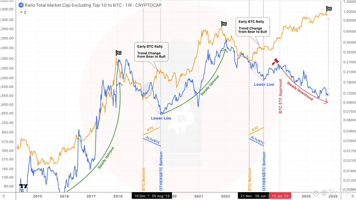 $BTC erreicht zuerst das Tief, #OTHERSBTC bildet in 6 Monaten ein niedrigeres Tief, wÀhrend $BTC aufwÀrts rallyt und die Trendrichtung von BÀren zu Bullen wechselt.