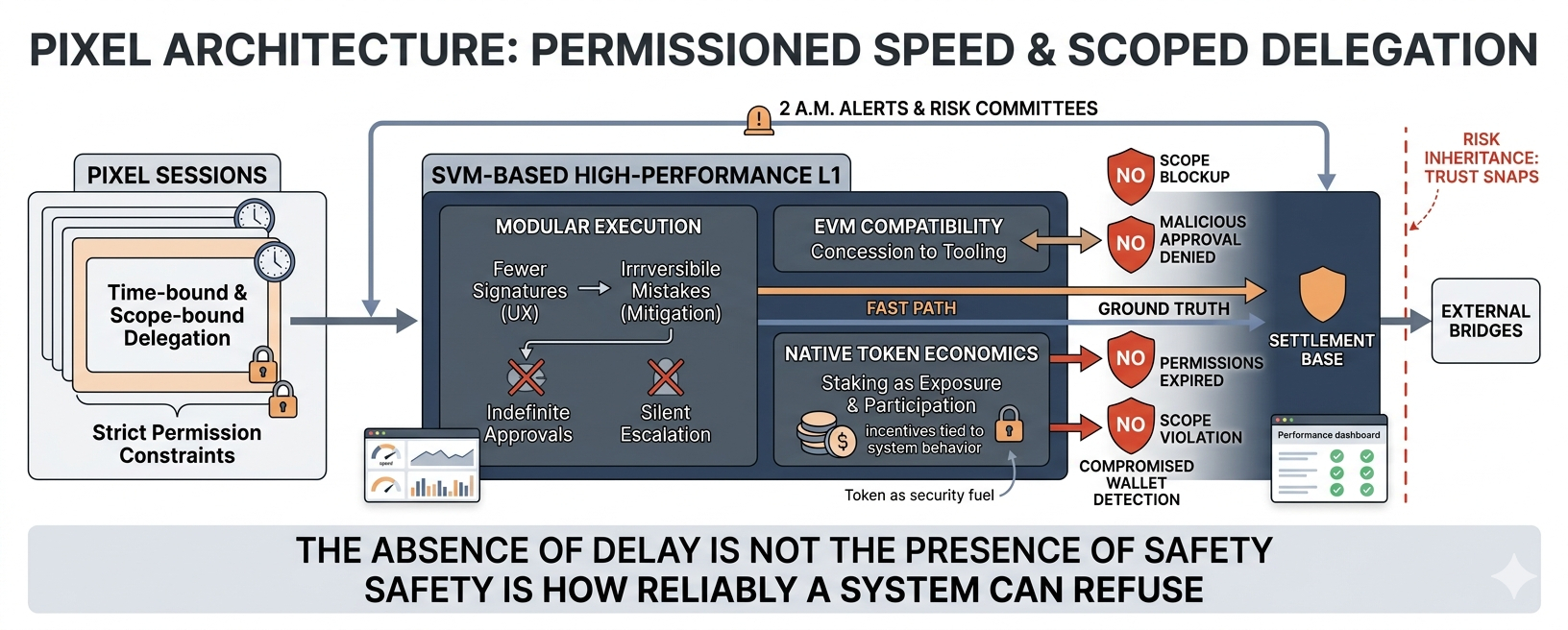 PIXEL does not solve this problem completely. No system does. What it does instead is refuse to hide behind speed as a proxy for correctness. It narrows permissions. It limits duration. It treats signatures as liabilities, not just proofs. It builds an execution environment that can move quickly while still being told “no” when it matters.