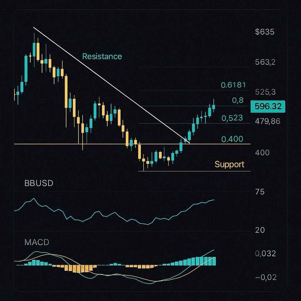 На денному таймфреймі BNB тримається в консолідації навколо $630–640. Це район, де раніше спостерігалося сильне накопичення. Тижневий тренд залишається обережно позитивним, але все залежить від закріплення вище локальних максимумів.