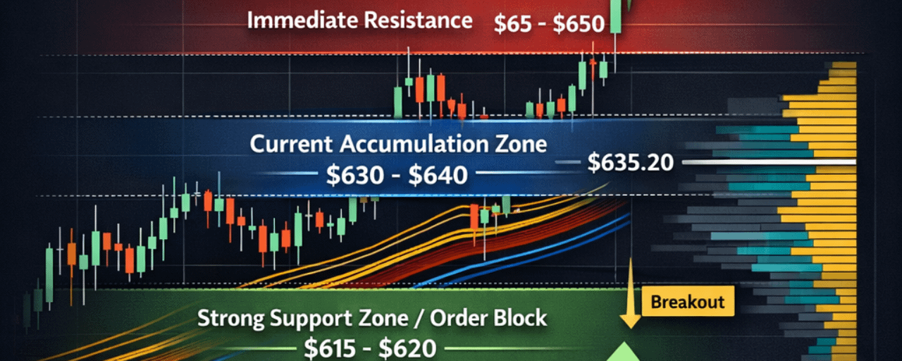 Основний об’єм проторговано в зоні $620–650. Ціна зараз знаходиться біля Value Area — класичне місце інтересу інституційних гравців. Підтримка: $615–620 (сильна зона). Опір: $645–650.