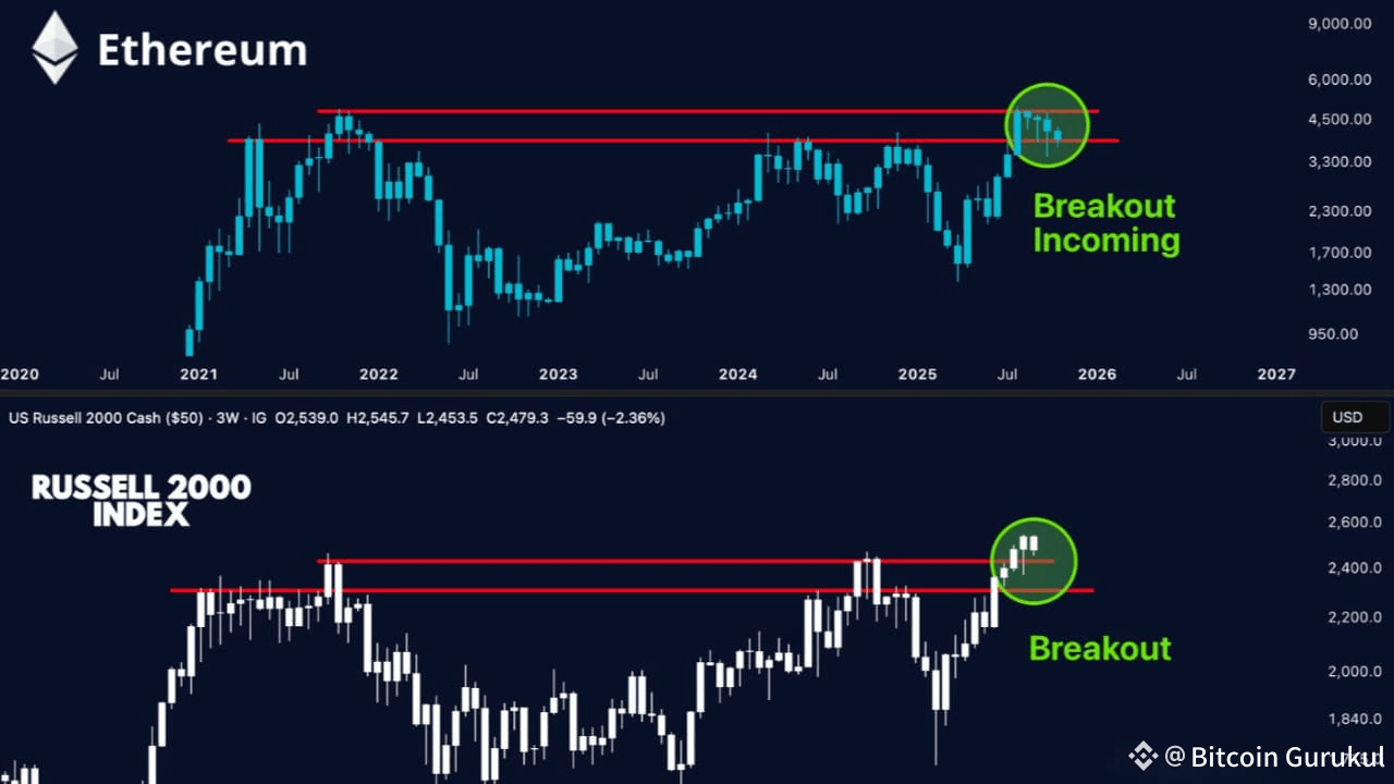 Ethereum, das genau auf dem gleichen Widerstandsniveau sitzt, das Russell gerade durchbrochen hat, ist kein Zufall – es ist die gleiche makroökonomische Kraft, die sich dem gleichen technischen Wendepunkt nähert, nur mit einer leichten Verzögerung.
