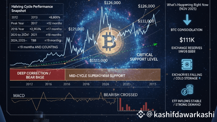 Stand November 2025 sind wir jetzt â19 Monate nach der Halbierung (19.â20. April 2024). Bitcoin hat sich von seinem Allzeithoch von fast 126.000 $ korrigiert und wird derzeit um 111.000 $ gehandelt â was den RĂŒckzĂŒgen nach dem Höchststand in jedem vorherigen Halbierungszyklus entspricht.