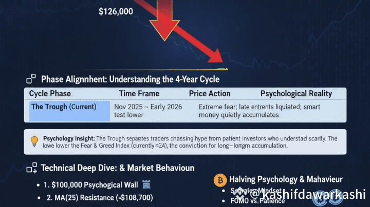 Der Tiefpunkt (Aktuell) Nov 2025 – Früh 2026 ~$100.000 → teste niedriger Extreme Angst; späte Teilnehmer liquidiert; kluges Geld akkumuliert leise.