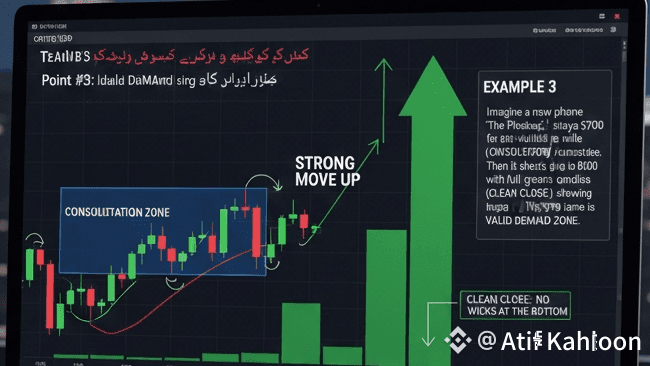 Sauberer Abschluss (صاف ستھری کلوزنگ): Um die Nachfragezone zu stärken, schließt der Preis so, dass keine langen "Wicks" (Schatten/Schnäbel) an der Unterseite der Kerzen entstehen. Ein langer Wick bedeutet, dass Verkäufer versucht haben, nach unten zu drücken, was die Nachfrage schwächt. Wenn die Kerze von unten vollständig gefüllt ist (d.h. "Keine Wicks an der Unterseite"), bedeutet dies, dass die Käufer mit aller Kraft den Preis nach oben gedrückt haben und kein Verkaufsdruck nach unten vorhanden war.