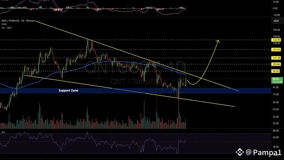 Was mir aufgefallen ist: QNT hat sich über eine kürzliche Konsolidierungszone geschoben, was andeutet, dass Käufer zurückkommen. Das Zusammenspiel von Volumen und Preis schreit nicht nach "Durchbruch", aber es blinkt ein gelbes Licht. Auf der anderen Seite, wenn der Markt sich dreht, könnte dieselbe Zone in eine Unterstützung fangen.