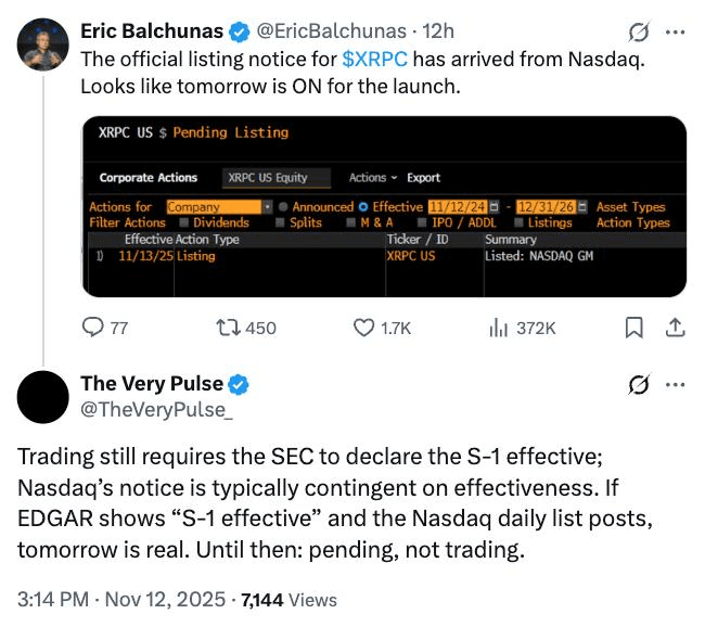 Andere Marktbeobachter, darunter Eleanor Teriot von Crypto America, teilten dieselbe Zuversicht und erklärten auf X, dass Nasdaq "die Einführung von XRPC beim Markteröffnung" am Donnerstag genehmigt habe, während andere darauf hinwiesen, dass die Nachricht von Nasdaq formale Verfahren seien, die nicht bedeuten, dass der Handel bereits erlaubt ist.