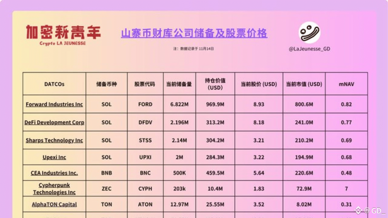 Und mit dem Ende der Regierungsstilllegung werden eine Reihe von Anträgen für Shitcoin ETFs genehmigt, und diese derzeit niedrig bewerteten Mainstream-Shitcoins werden steigen.Dabei $SOL in den DATs haben viele auch weiterhin zugekauft und SOL gestakt. Und viele dieser DATs-Unternehmen sind nicht an der US-Börse gelistet, ihre IPOs bieten ebenfalls große Chancen.