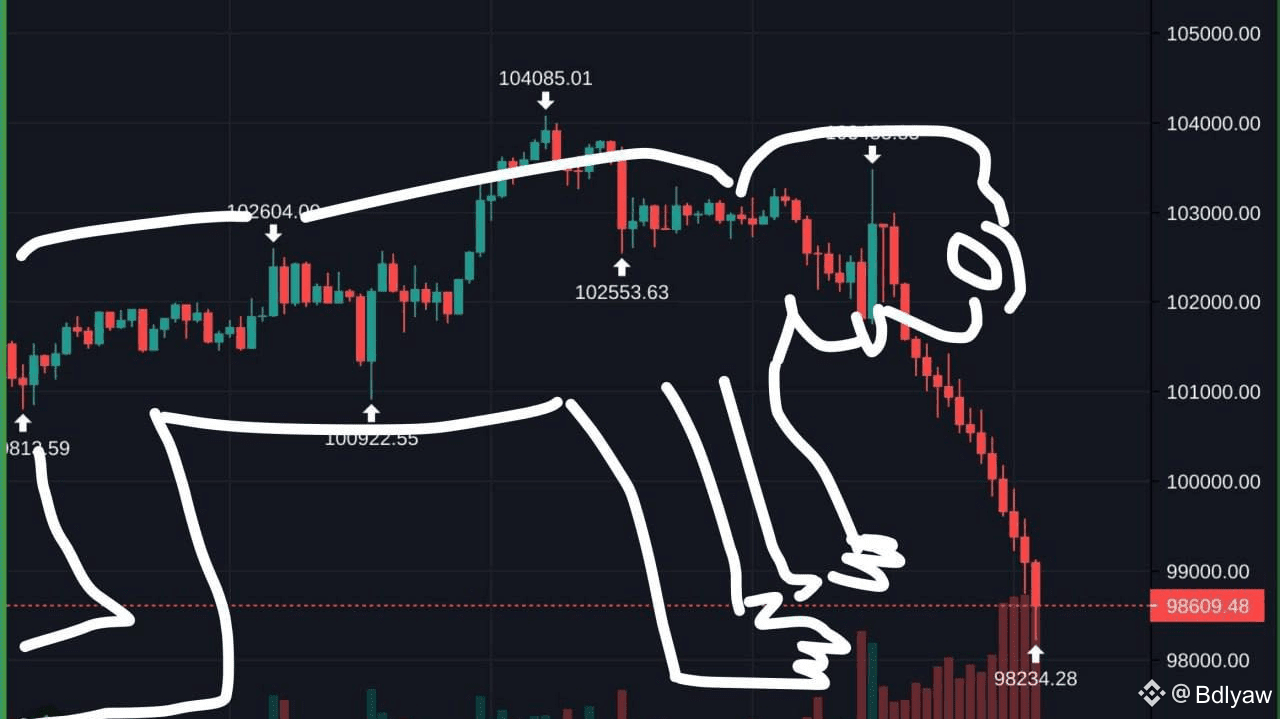 Wenn die BTCUSDT-Diagramme an eine Achterbahn erinnern, schaltet die Krypto-Community den Humor-Modus ein. Der letzte plötzliche Rückgang des Bitcoin unter die Schlüsselmarken, wie dieses Diagramm mit dem umrandeten Silhouette eines Affen zeigt, hat eine Welle von Memes und satirischen Kommentaren ausgelöst.