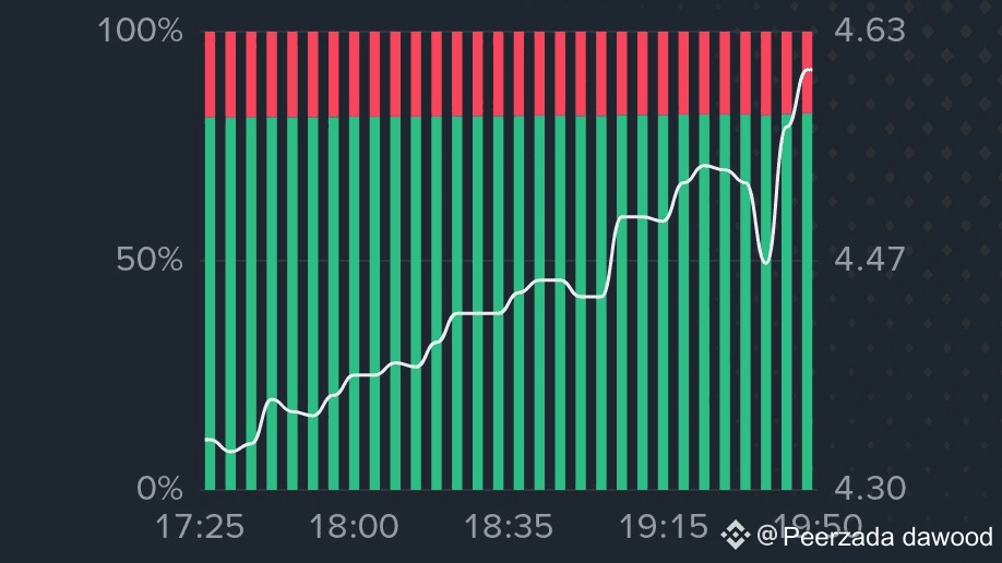 Schneller Verhältnis-Spike: Das Long/Short-Verhältnis (weiße Linie) erlebte in den letzten Momenten des Charts (etwa 19:15 bis 19:50) einen scharfen und signifikanten Anstieg, der von etwa 4.47 auf 4.63 (der Spitzenwert auf der rechten Achse) anstieg. Dies ist ein sehr hohes Verhältnis, was darauf hindeutet, dass die überwiegende Mehrheit der Top-Konten auf weitere Preiserhöhungen positioniert ist.