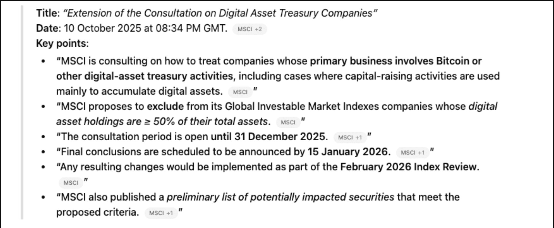 3. Am GENAUEN 10. Oktober veröffentlichte MSCI, das zweitgrößte Indexunternehmen der Welt, das Folgende. Sie stellen in Frage, ob Unternehmen, die Krypto-Vermögenswerte als ihr Kerngeschäft halten, als "Unternehmen" oder "Fonds" betrachtet werden sollten.