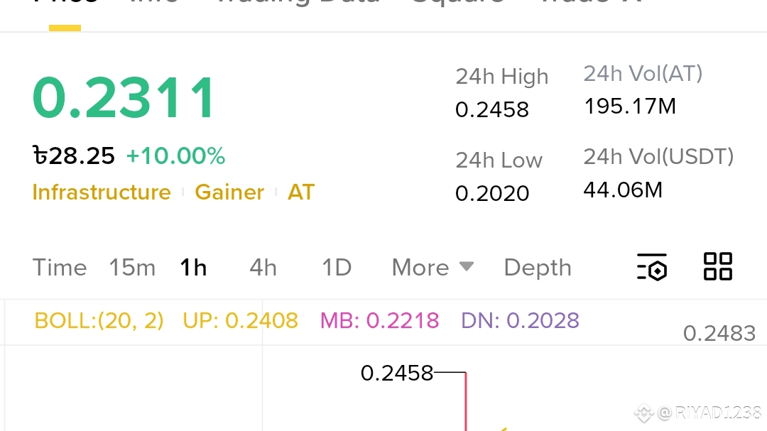 $AT /usdt trading pair on a likely 1-hour timeframe (based on the selected '1h' option). The current price is 0.2311, up +10.00% for the day, indicating a strong positive momentum.