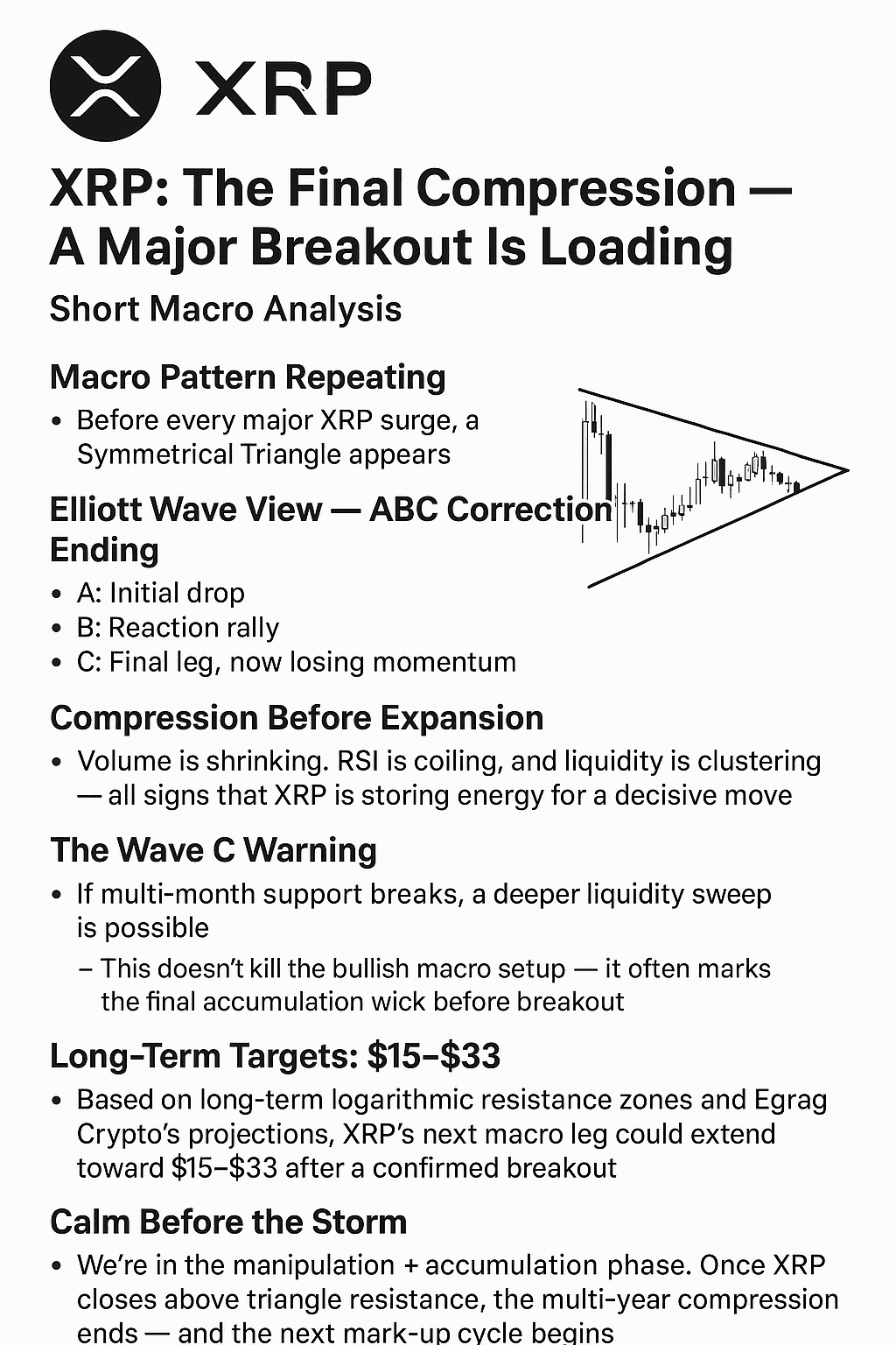 Sobald XRP über dem Widerstand des Dreiecks schließt, endet die mehrjährige Kompression – und der nächste Markierungszyklus beginnt.