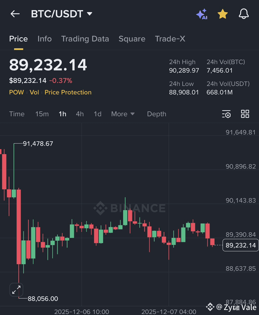 Ich stelle fest, dass der Preis um 0,37 % auf 89.232,14 USDT gefallen ist, nachdem er die 90.000 $-Marke abgelehnt hat, nachdem er ein 24h-Hoch von 90.289,97 $ erreicht hat.
