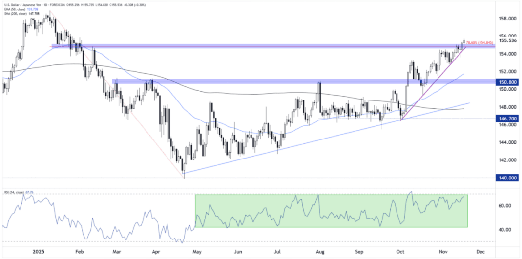Trotz der Aufwärtsbeschleunigung ist das Paar noch nicht technisch „überkauft“ auf dem 14-Tage-RSI, was auf weitere Aufwärtspotenziale hinweist, insbesondere bei einem starken Arbeitsmarktdatenbericht, der die impliziten Chancen einer Fed-Zinssenkung im Dezember weiter verringert. Andererseits könnte ein schwächer als erwarteter Bericht zu einer bärischen Drehung führen. In diesem Szenario könnte ein Bruch unter die steigende Trendlinie die Grundlage für einen tiefgreifenderen Rücksetzer in Richtung des 50-Tage-EMA im Bereich der 152,00 bilden.