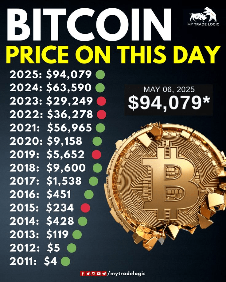 BTC) hat ein unglaubliches langfristiges Wachstum gezeigt, wie durch dieses beliebte Infografik hervorgehoben, die seinen Preis am 6. Mai jedes Jahr verfolgt. Von bescheidenen Anfängen mit nur 4 $ im Jahr 2011 bis zu 94.079 $ am 6. Mai 2025 spiegelt BTCs Reise seine Volatilität und Widerstandsfähigkeit wider. Während die genauen Schlusskurse je nach Quelle leicht variieren können, ist der Trend klar: massive Aufwärtsbewegungen im Laufe der Zeit trotz Bärenmärkte.