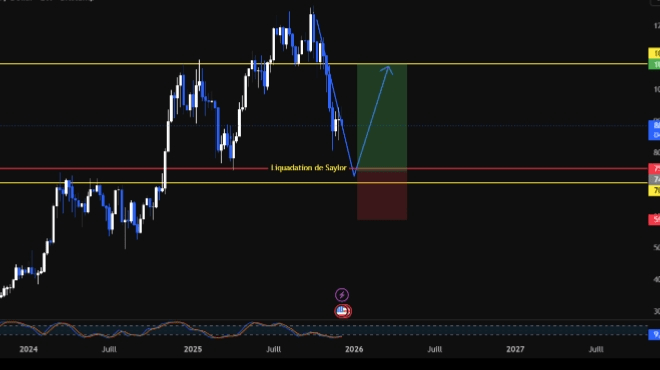 74K ist nicht nur eine technische Unterstützung. Es ist die Saylor-Ebene, die, wo der größte Unternehmensinhaber von Bitcoin in den Verlust geht. Der Markt wird wahrscheinlich dort testen, auch nur um zu sehen, wer einknickt.