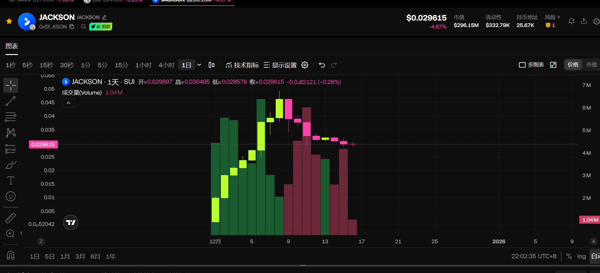 Zweitens wurde der $JACKSON-Token zu $0,01 eröffnet und stieg innerhalb von 10 Tagen um 500 %, erreichte einen Höchststand von $0,05 und liegt jetzt bei etwa $0,03, wobei es sich noch in der Phase der Wertentdeckung befindet.