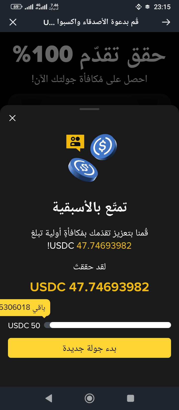Wie in der Abbildung zu sehen, hat die Plattform mir eine echte Belohnung in USDC gewährt, die bei: