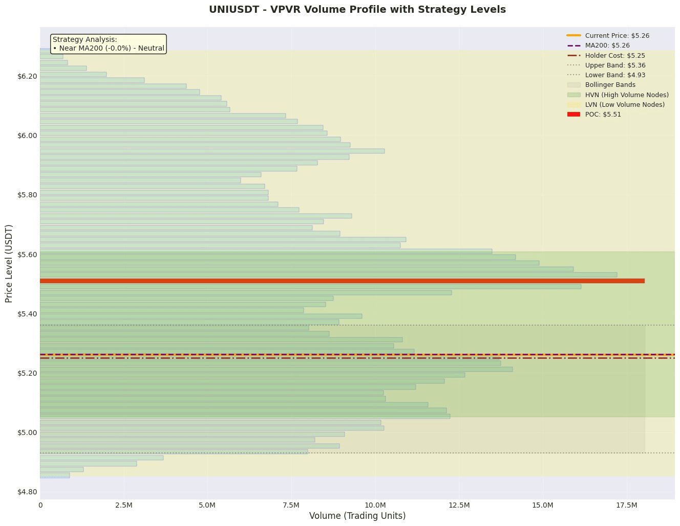 1. Wertankerbereich: Basierend auf VPVR-Daten liegt POC (maximales Handelsvolumen) bei 5.5099, was den zentralen "Wertanker" in diesem Wettkampf darstellt. Der aktuelle Preis von 5.261 liegt unter dem POC. Der Value Area (Wertbereich) liegt bei 4.9540 - 6.0062, der aktuelle Preis liegt im unteren Bereich dieses Bereichs. POC (5.5099) wird der primäre Widerstand für den Preisanstieg sein, während VAL (4.9540) die entscheidende Unterstützung darstellt und zusammen mit der unteren Bollinger-Band-Grenze (4.9304) einen starken Unterstützungsbereich bildet.