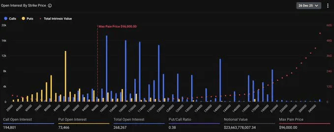 Hier ist, was du verstehen musst: $23,66 Milliarden an Bitcoin-Optionsverträgen laufen direkt nach Weihnachten aus. Um das ins rechte Licht zu rücken, reden wir von mehr als 1 % der gesamten Marktkapitalisierung von Bitcoin, die an nur einem Tag abgerechnet wird. Dies ist nicht dein typischer Freitag-Ablauf. Dies ist ein marktbewegendes Ereignis, auf das sich die klugen Investoren seit Wochen vorbereiten.