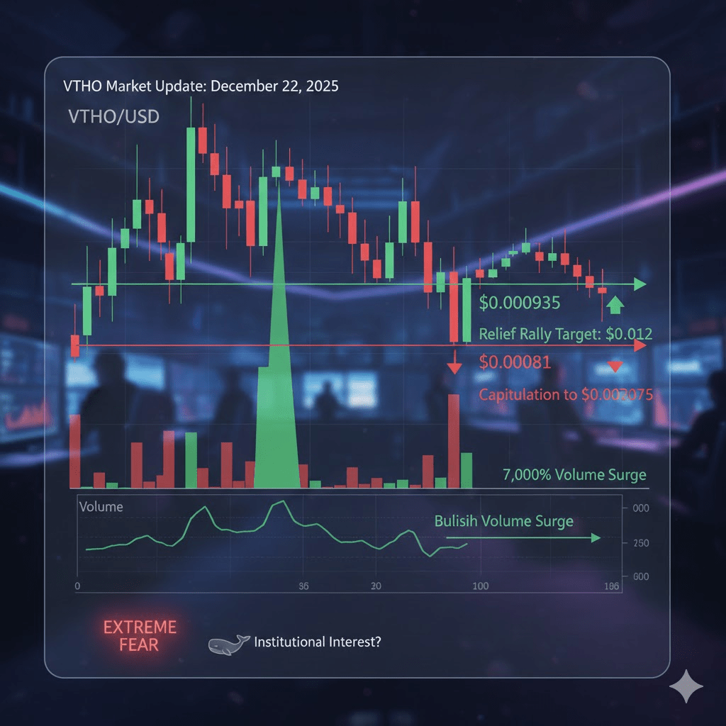 Bullisches Szenario: Wenn VTHO es schafft, über $0.000935 zu schließen, könnte dies eine Erholungsrallye in Richtung des Widerstandsniveaus von $0.0012 auslösen. Der RSI zeigt eine leichte bullische Divergenz auf niedrigeren Zeitrahmen, was darauf hindeutet, dass die überverkauften Bedingungen sich abkühlen könnten.