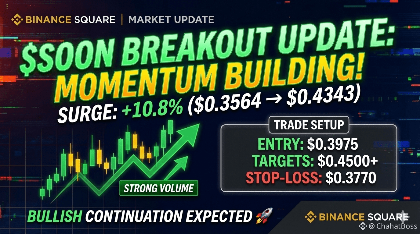 $SOON ist bereits um +10,8% gestiegen, von $0,3564 auf $0,4343, und die Struktur deutet darauf hin, dass die Bewegung möglicherweise noch nicht abgeschlossen ist. Dieser Ausbruch wurde von starkem Volumen und einer klaren vertikalen Expansion unterstützt, was eine echte Nachfrage und nicht nur Lärm bestätigt.