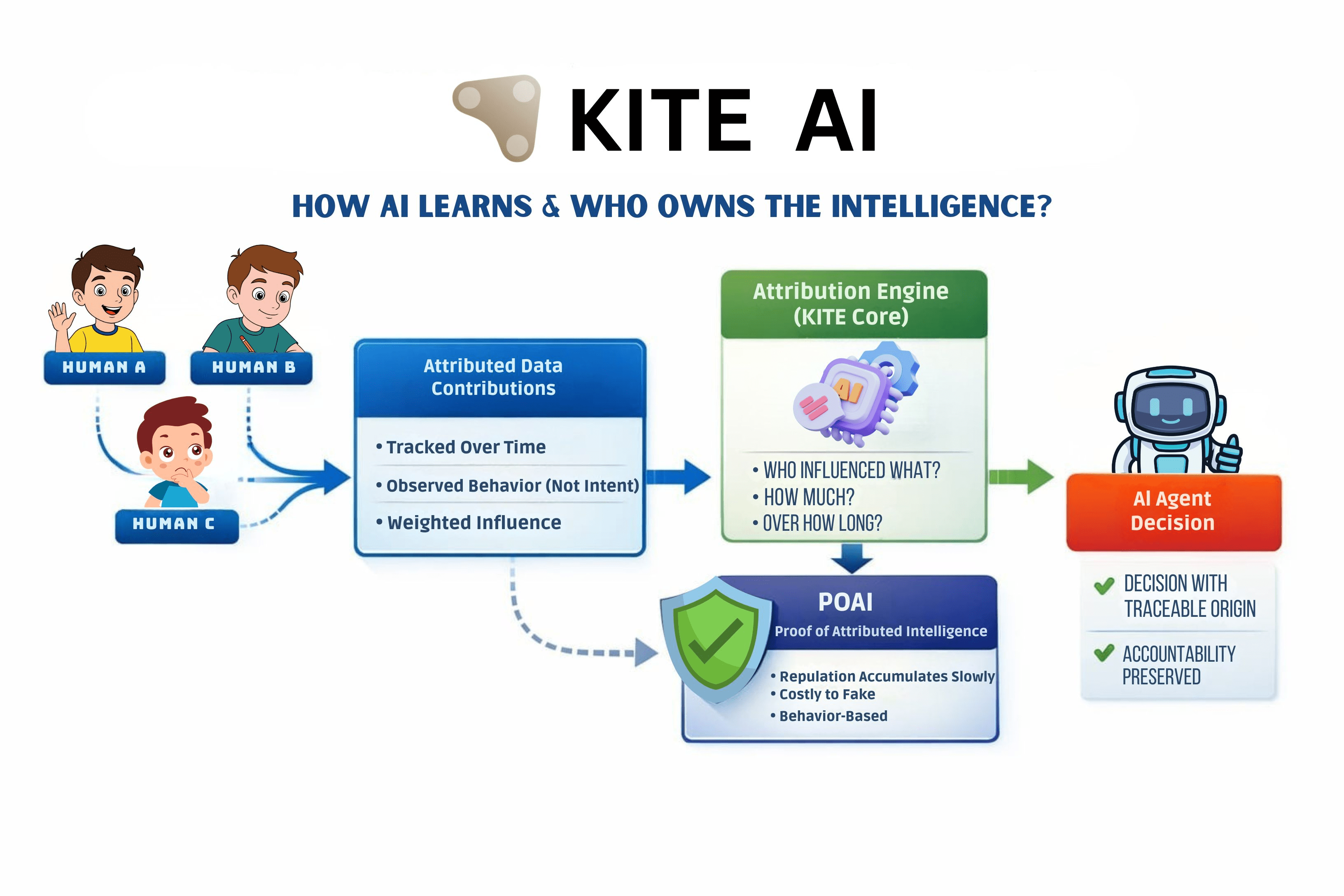 Was meine Sichtweise beim Studium von KITE veränderte, war nicht die KI-Schicht, sondern wie Verhalten zugeordnet und beibehalten wird. KITE behandelt das Nutzerverhalten eher wie einen Eintrag in ein Hauptbuch als wie einen Trainingsabfall. Ein konkretes Beispiel macht dies klarer. Wenn ein Agent seine Strategie aktualisiert, verfolgt das System, welche menschlichen oder agentenbasierten Signale diese Änderung beeinflusst haben, und weist gewichtete Zuordnungen basierend auf beobachtetem Verhalten über die Zeit zu, nicht auf der erklärten Absicht. Diese Zuordnung fließt in PoAI ein, eine verhaltensbasierte Reputationsschicht. Intelligenz schwebt nicht frei umher. Sie akkumuliert entlang nachverfolgbarer Pfade.