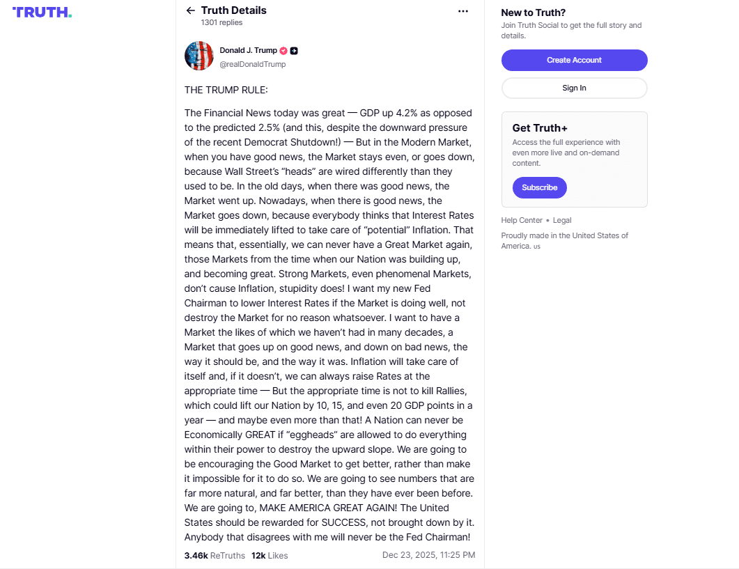 Dies ist ein politisches Rezept für die Geldpolitik, das nachhaltiges Wachstum des Aktienmarktes und eine Expansion des BIP priorisiert, präventives Inflationsbekämpfen als schädlich ansieht und sich für eine Fed einsetzt, die den Anweisungen des Präsidenten folgt, um "große" Märkte zu ermöglichen.
