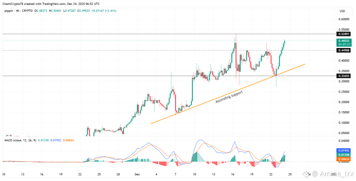 يحترم PIPPIN هيكلًا صعوديًا واضحًا على الإطار الزمني لأربع ساعات، حيث انطلق السعر من نطاق الدعم بين 0.32 – 0.33.