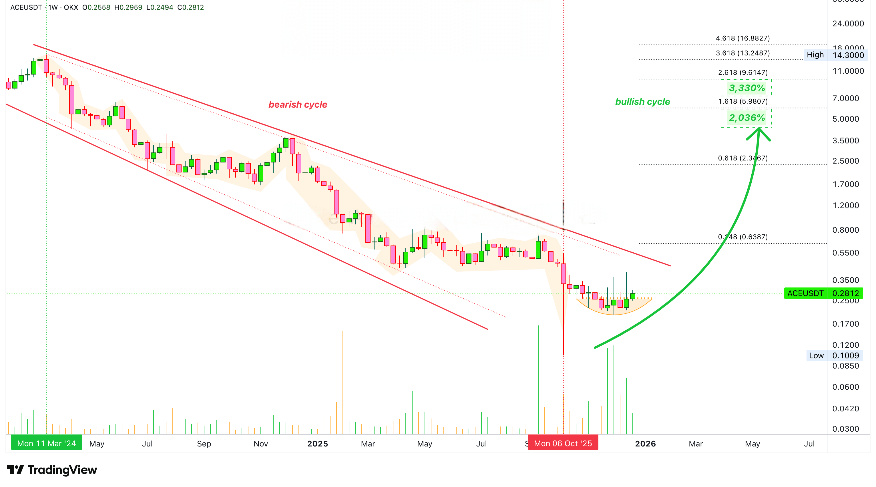 Ein bullischer Zyklus folgt einem bärischen Zyklus. Ebenso wie man keine aufeinanderfolgenden Bullenmärkte haben kann, kann man auch keine zwei bärischen Märkte hintereinander haben. Da ACE bereits einen bärischen Markt durchlaufen hat, wissen wir, dass nun ein bullischer Markt folgt. Der beigefügte Chart ist der Beweis dafür.