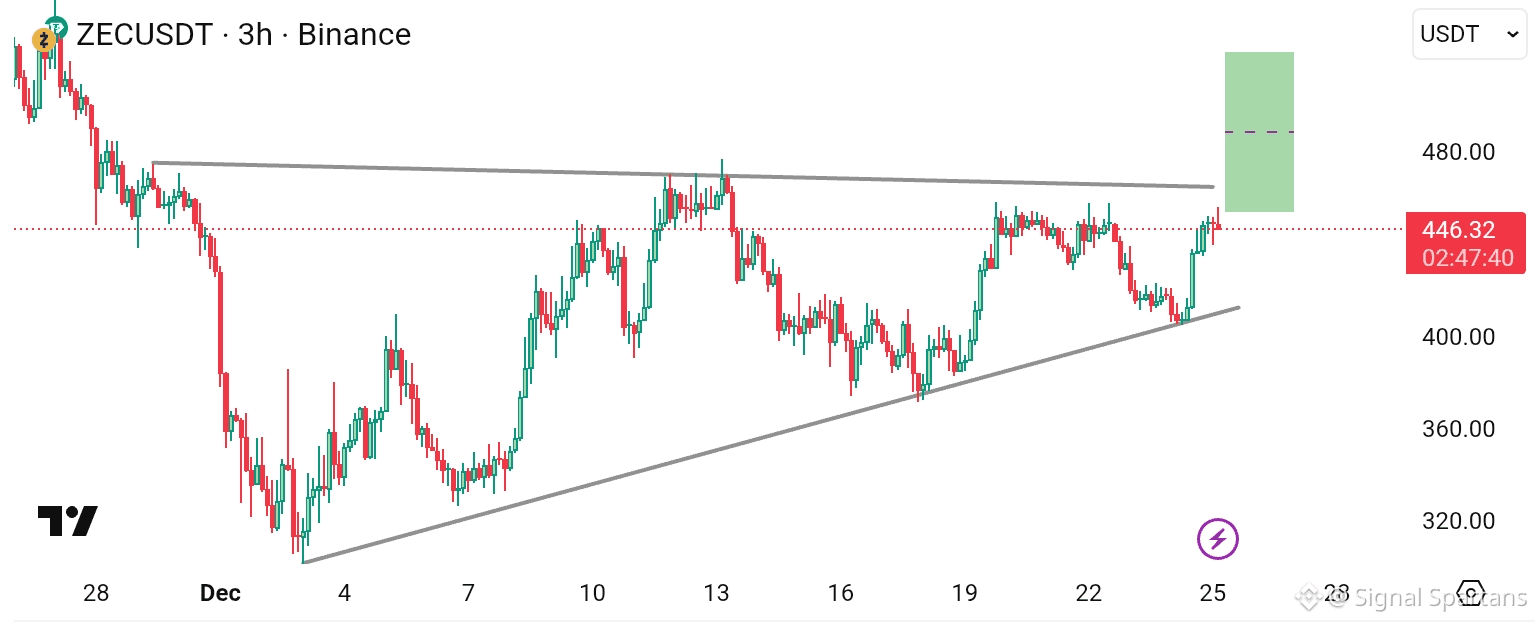 $ZEC is printing a clean ascending triangle 📈, making higher lows while repeatedly pressing the range top near $445–$450 — pressure is building and buyers are not backing off 👀. This compression inside structure is exactly what I wait for as per the plan 🧠.