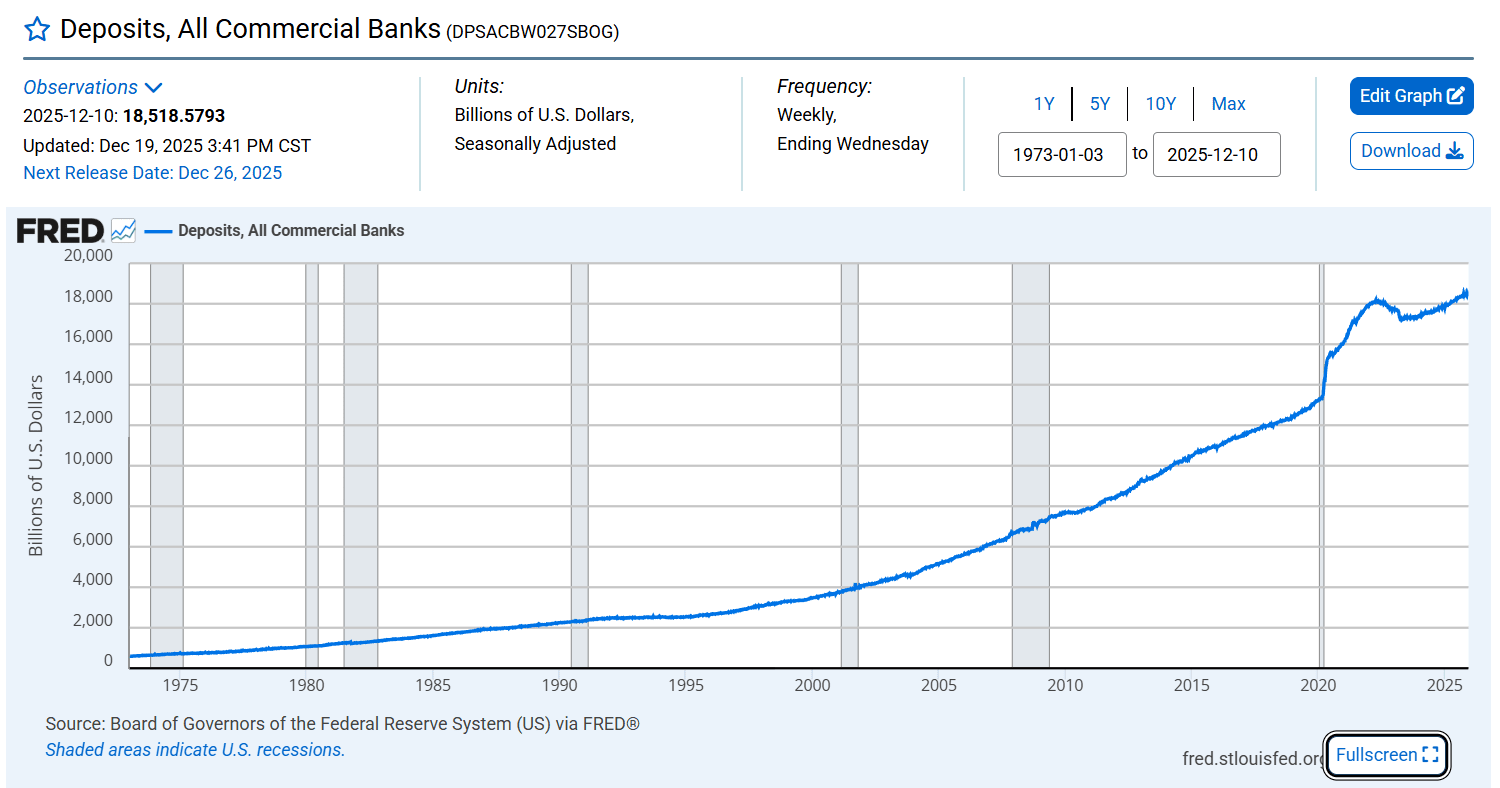 Laut der H.8-Statistikveröffentlichung der Federal Reserve beliefen sich zum 10. Dezember 2025 die Gesamteinlagen aller US-Geschäftsbanken auf 18.518,5793 Milliarden USD oder 18,5185793 Billionen USD, was den Umfang der Abwicklungs- und Liquiditätssysteme unterstreicht, die nun auf Effizienzgewinne durch blockchainbasierte Infrastruktur untersucht werden.