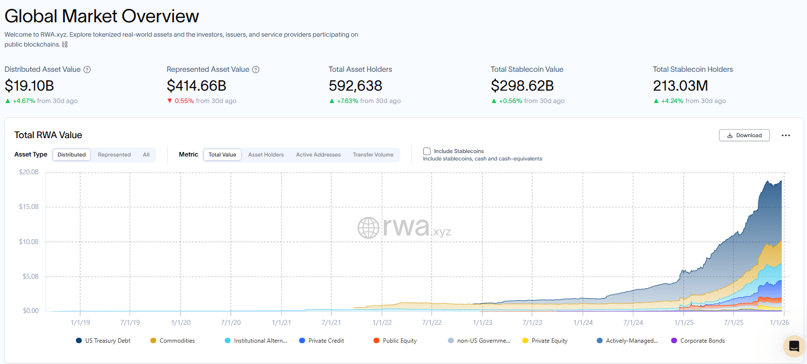 Laut RWA.xyz berichtete die Plattform am 25. Dezember 2025 von einem verteilten Vermögenswert von 19,10 Milliarden USD, einem repräsentierten Vermögenswert von 414,66 Milliarden USD und 592.638 Gesamtvermögensinhabern, die einen überprüfbaren Schnappschuss des On-Chain-RWA-Marktes zu diesem Zeitpunkt bieten.