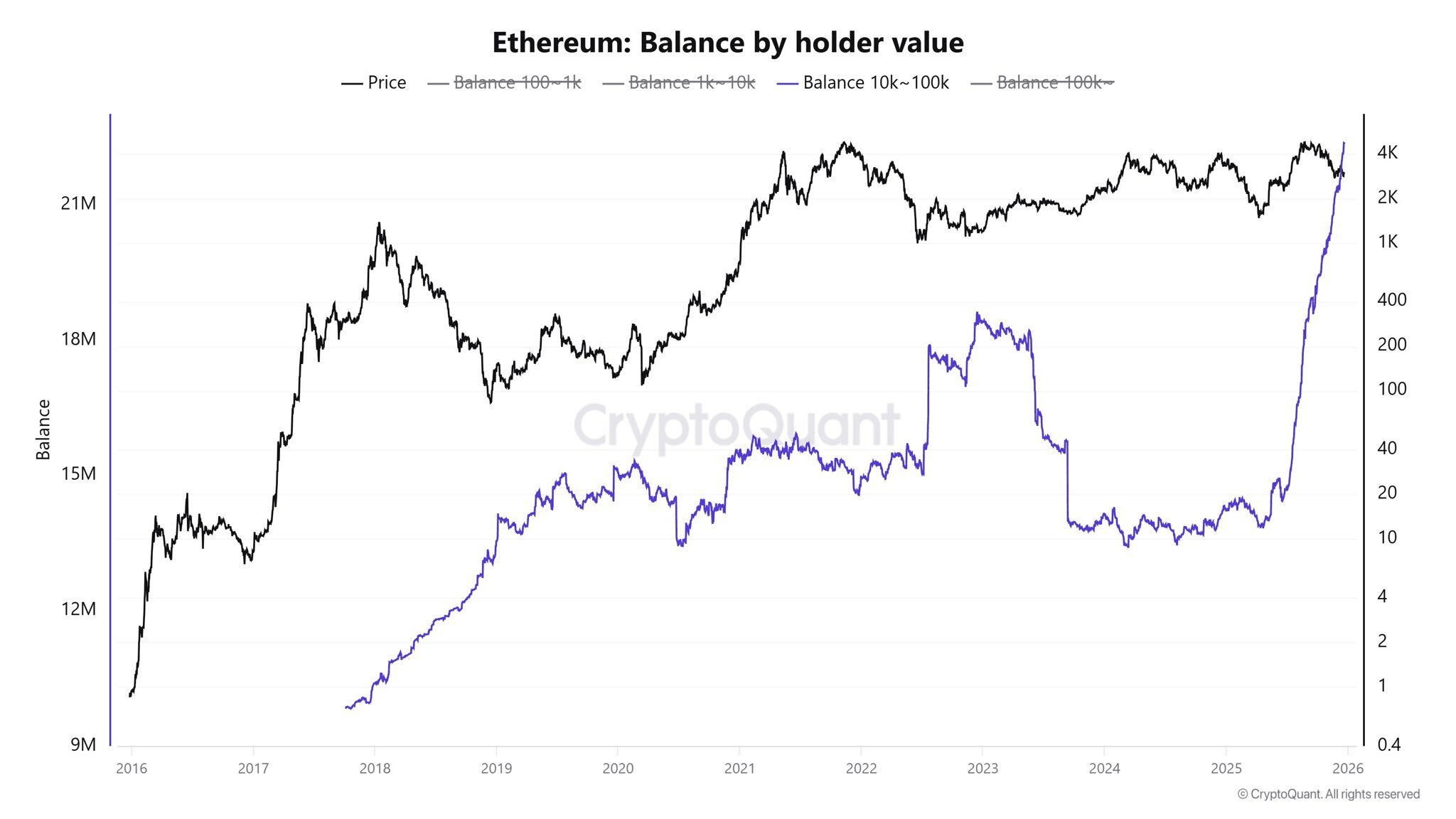 On-Chain-Daten unterstützen dieses institutionelle Verlangen. Die Kohorte der "Wale", die zwischen 10.000 und 100.000 ETH halten, hat die Ansammlung Ende 2025 aggressiv erhöht und kontrolliert nun insgesamt 21 Millionen ETH.