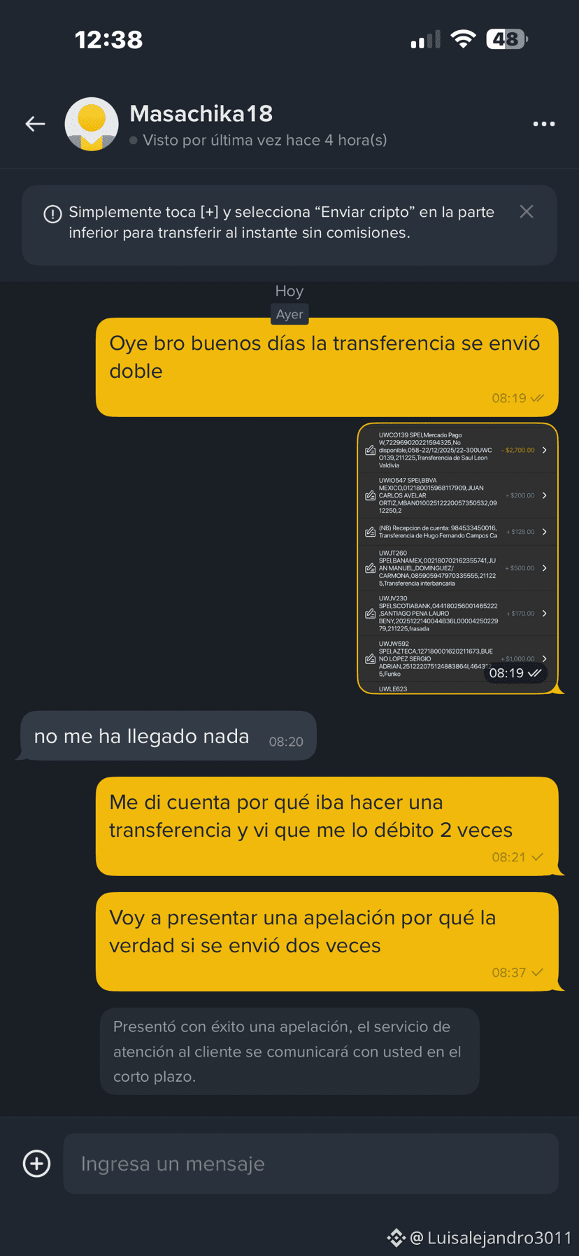 Mira lo que me paso hace poco, por si les llega a suceder a ustedes, por cosas de los bancos,mi transferencia se realizo dos veces por una cantidad de 8,999,94 Mex y contacte a la contraparte para comentarle lo sucedido y me dice que no le llego nada a ver que el no tenía la intención de devolverme el dinero que era en total 490,82 Usd$ procedí a una apelación en la cual gracias a soporte le bloquearon los fondos a la contraparte y se vio obligado a devolver los fondos Si les sucede algo parecido contáctame y te ayudo con mucho gusto #uscryptostakingtaxreview2026