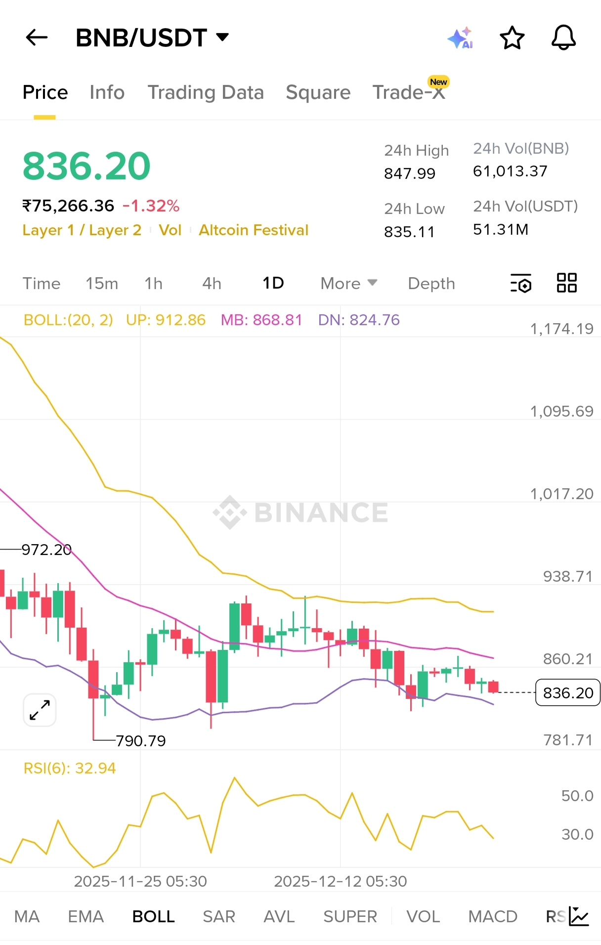 BNB befindet sich in einer schwachen, korrektiven Phase im Tageschart, handelt um 836 USDT und umschließt das untere Bollinger-Band, sodass der Momentum leicht bärisch/seitenwärts ist, anstatt momentan stark bullisch zu sein. Für einen aktiven Trader sieht es eher nach einer Range- oder Bounce-Trading-Umgebung aus als nach einem sauberen Ausbruch nach oben.