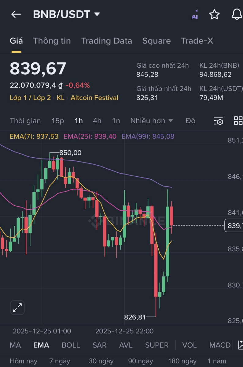 $BNB zeigt Anzeichen einer kurzfristigen Erholung nach einem starken Rückgang in die Nachfrage. Der Preis durchbrach die Unterstützungszone 826–830 und reagierte scharf, indem er eine klare bullische Ablehnungs-Kerze druckte, während EMA(7) beginnt, sich nach oben zu drehen. Das bedeutet, dass der Preis weiterhin unter EMA(99) bleibt, sodass die breitere Struktur noch korrektiv ist.