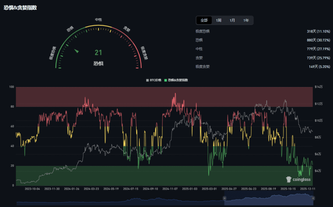 当前市场情绪为21(恐惧),市场情绪总体低迷,避险情绪盛行。总体而言,这种极度恐惧状态表明市场正处于压力期,短期风险较高,但对价值投资者可能预示反转机会。建议结合具体市场和基本面分析决策,不要仅凭情绪指数操作。