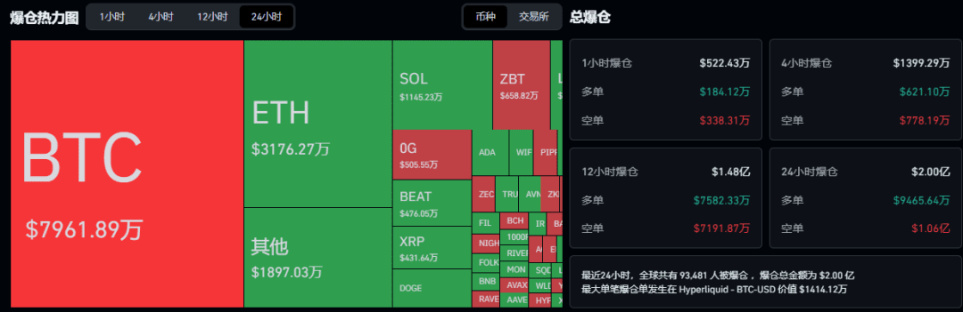 24小时全网共有93,481人被被爆仓,总额2.00亿美元,其中多头惨遭血洗($9465.64万),空头也难幸免($1.06亿)。