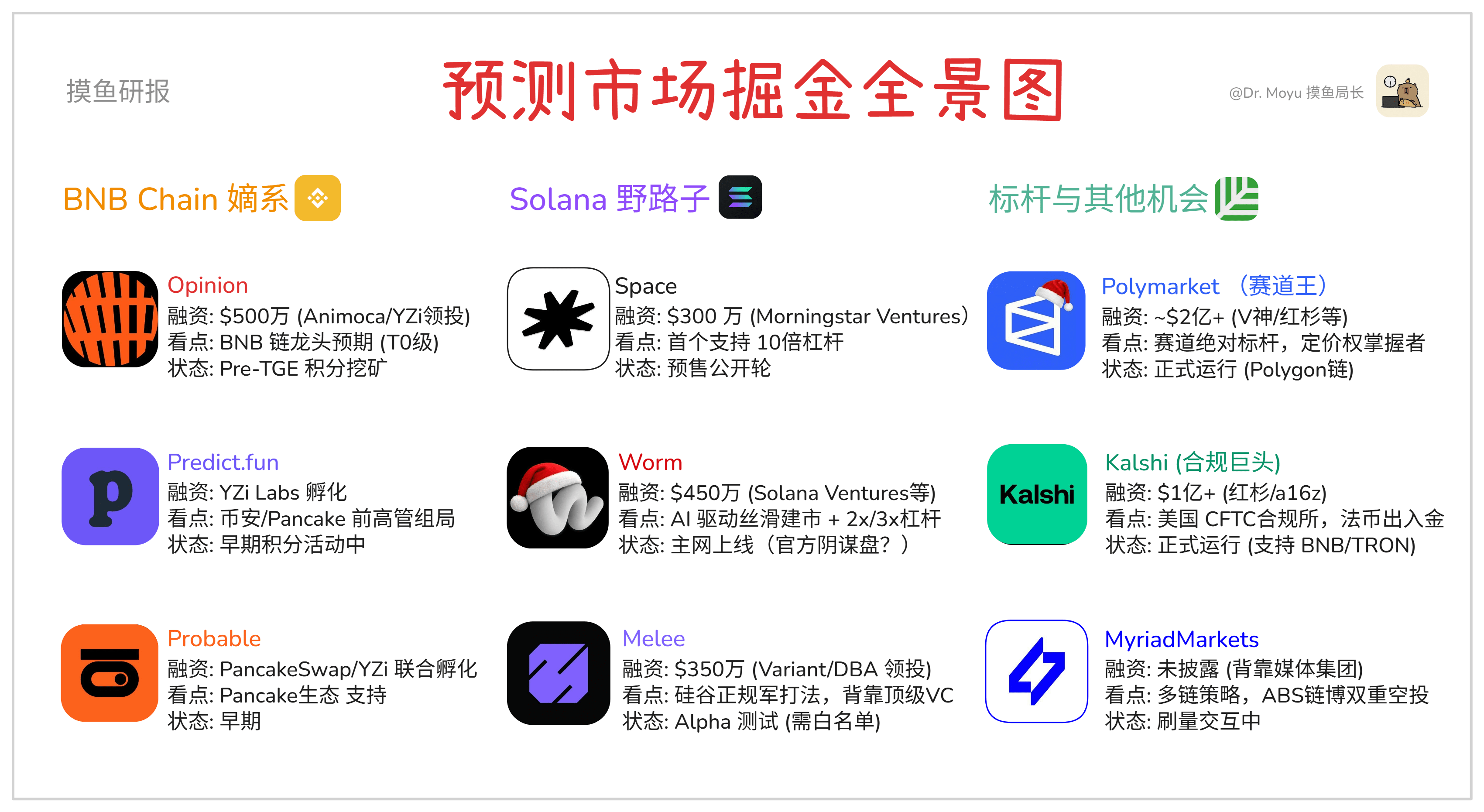 Entsprechend dem Fluss des Kapitals habe ich eine Liste der aktuellen Mainstream-Öffentlichen Blockchains für den Prognosemarkt zusammengestellt. Polymarket hat das PMF durchlaufen, die nächsten Punkte sind der Wettbewerb um die Legitimität der BNB-Kette und das Hebelspiel der Solana-Kette.