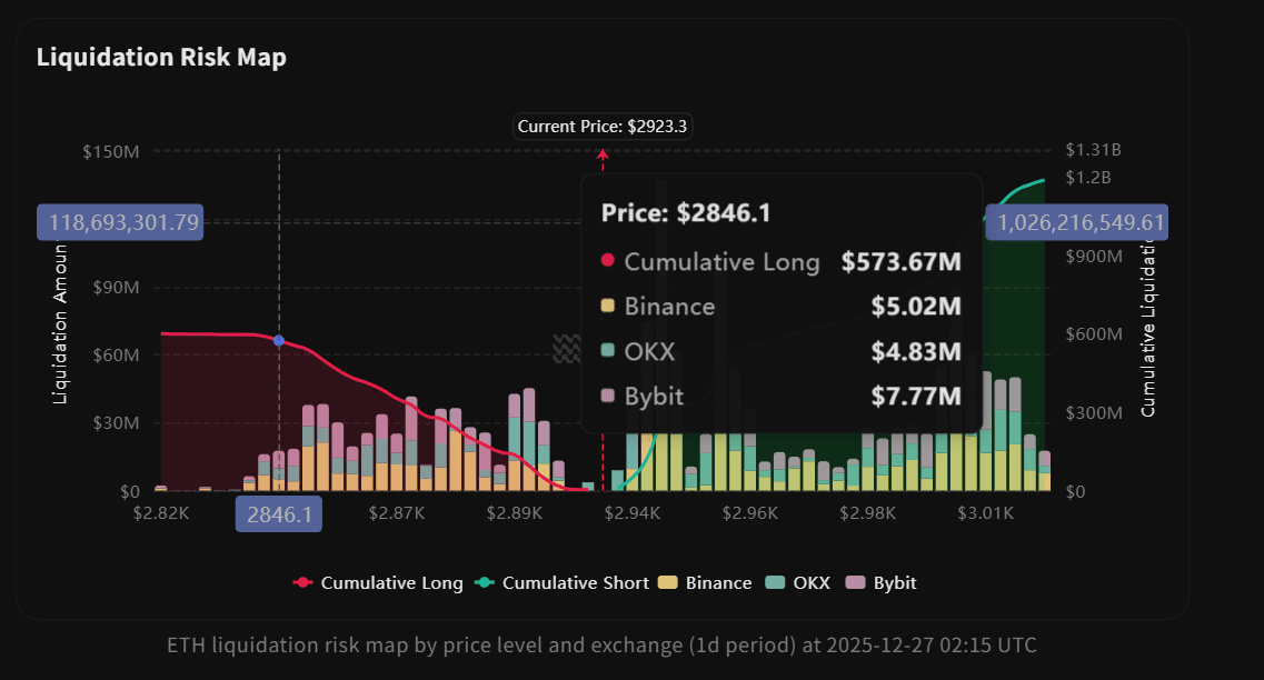 Hohes Risiko für Bullen: Unter dem ETH-Preis **$2,816-$2,843 gibt es eine Konzentration von Bullenpositionen über $600 Millionen**, ein Bruch wird einen Wasserfall auslösen.
