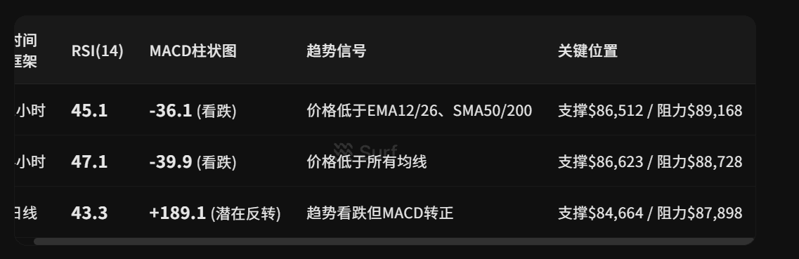 Schlüsselbereich: Preise bewegen sich im mittleren bis unteren Bollinger-Band ($86,512-$87,480), ein Bruch des $86,500 Unterstützungsclusters wird die Abwärtsbewegung zu $84,664 beschleunigen.