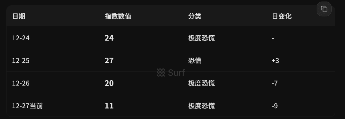 Der aktuelle Markt befindet sich in einem Zustand extremer Angst (Angstindex im Bereich 11-27), BTC/ETH zeigt einen Nettomittelzufluss in die Börse, das Verhalten der On-Chain-Großanleger ist diversifiziert (BTC hauptsächlich verteilt, ETH kontinuierlich akkumuliert), technische Indikatoren deuten kurzfristig auf einen Rückgang hin, aber es gibt keine Überverkaufsbedingungen, in den letzten 3 Tagen gab es Liquidationen über 180 Millionen Dollar. Gesamteinschätzung: Marktentwicklung ist schwach, Feiertagsbedingte geringe Liquidität verstärkt die Volatilität, kurzfristig unter Druck, aber nicht in einer extremen Verkaufszone.