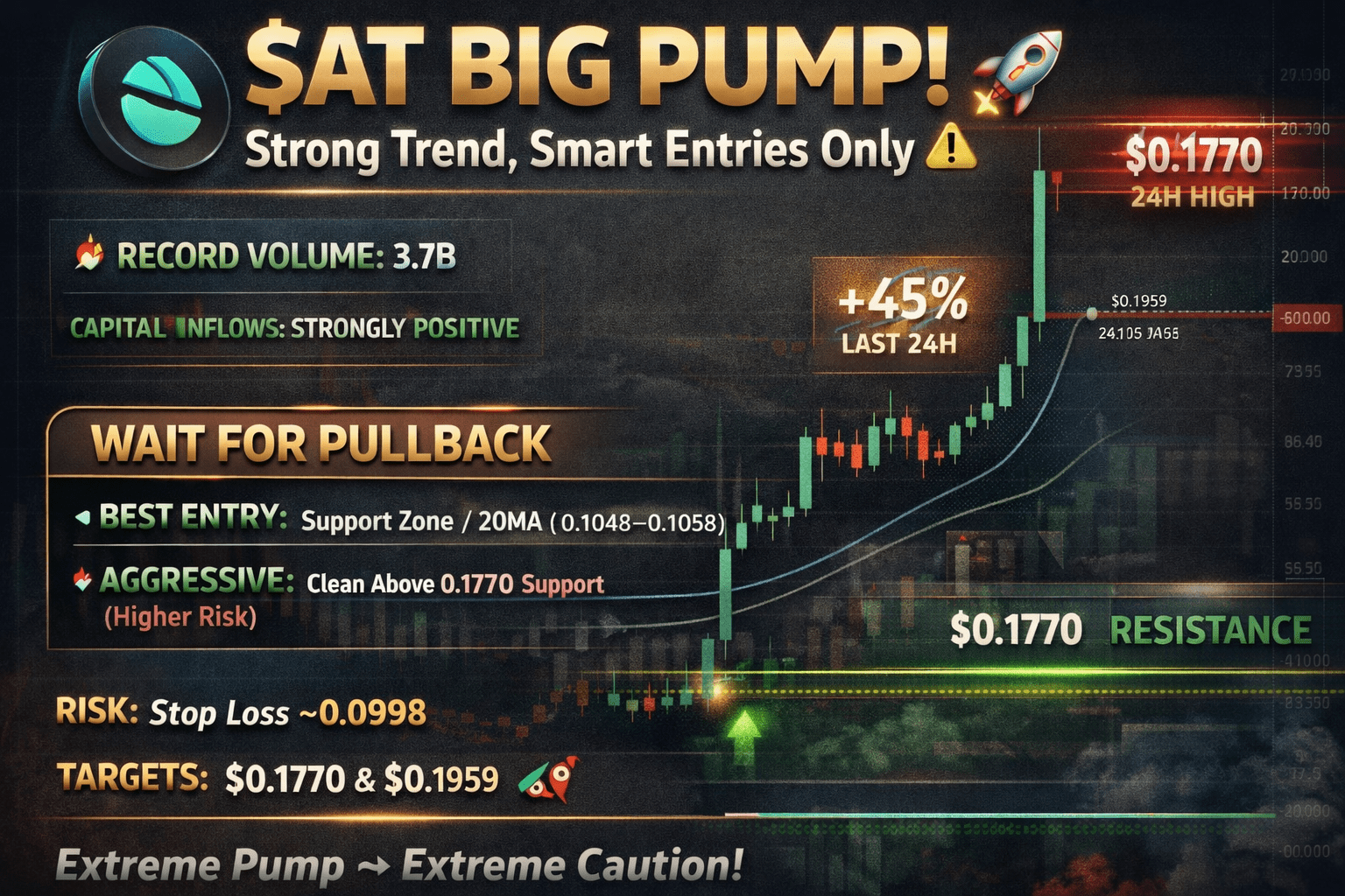 $AT hat gerade einen massiven Ausbruch geliefert, der in den letzten 24 Stunden um mehr als 45% gestiegen ist und eine seiner stärksten täglichen Bewegungen bisher zeigt. Was wirklich heraussticht, ist das Volumen – fast 3,7B, weit über der vorherigen Aktivität. Dieses Volumenlevel signalisiert echte Marktteilnahme und aggressives FOMO, nicht einen Spike bei geringer Liquidität.